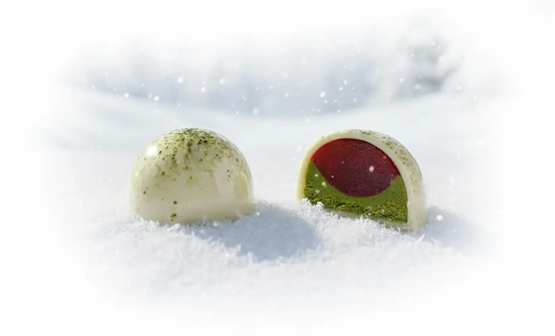 Une praline à la coque au chocolat blanc 32%, pâte de fruit framboise déstructurée, ganache Matcha et chocolat blanc..